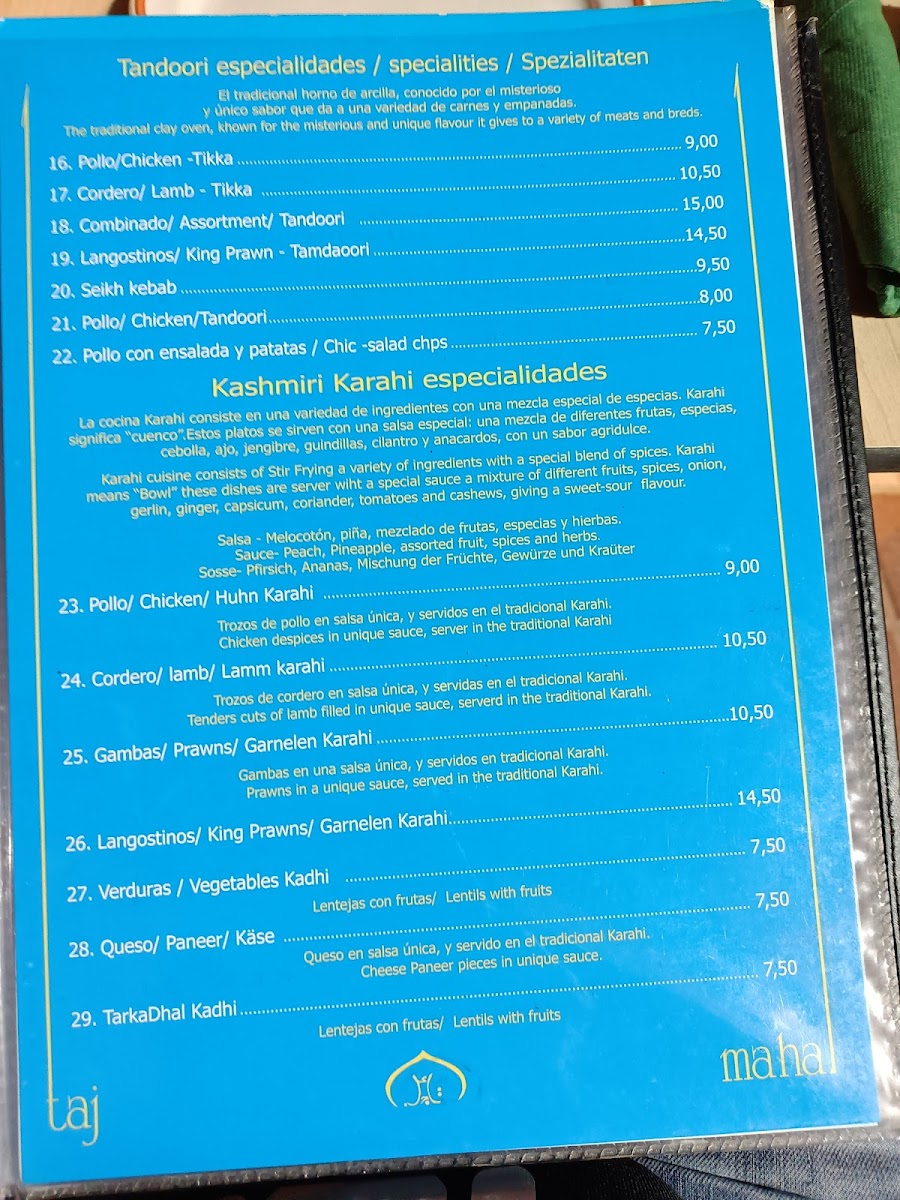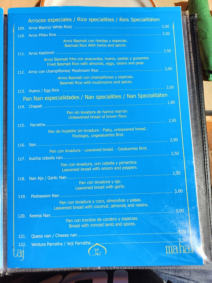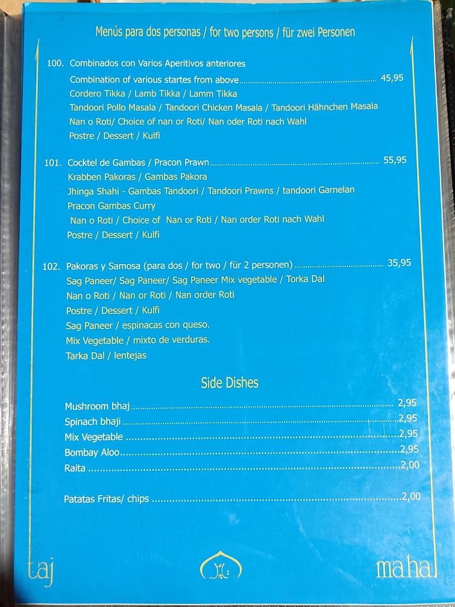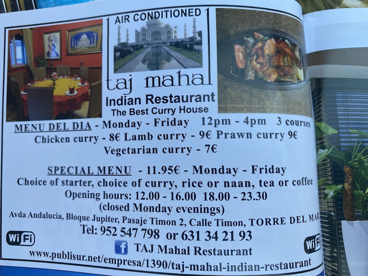 Taj Mahal Indian Restaurant, Torre del Mar Menu
